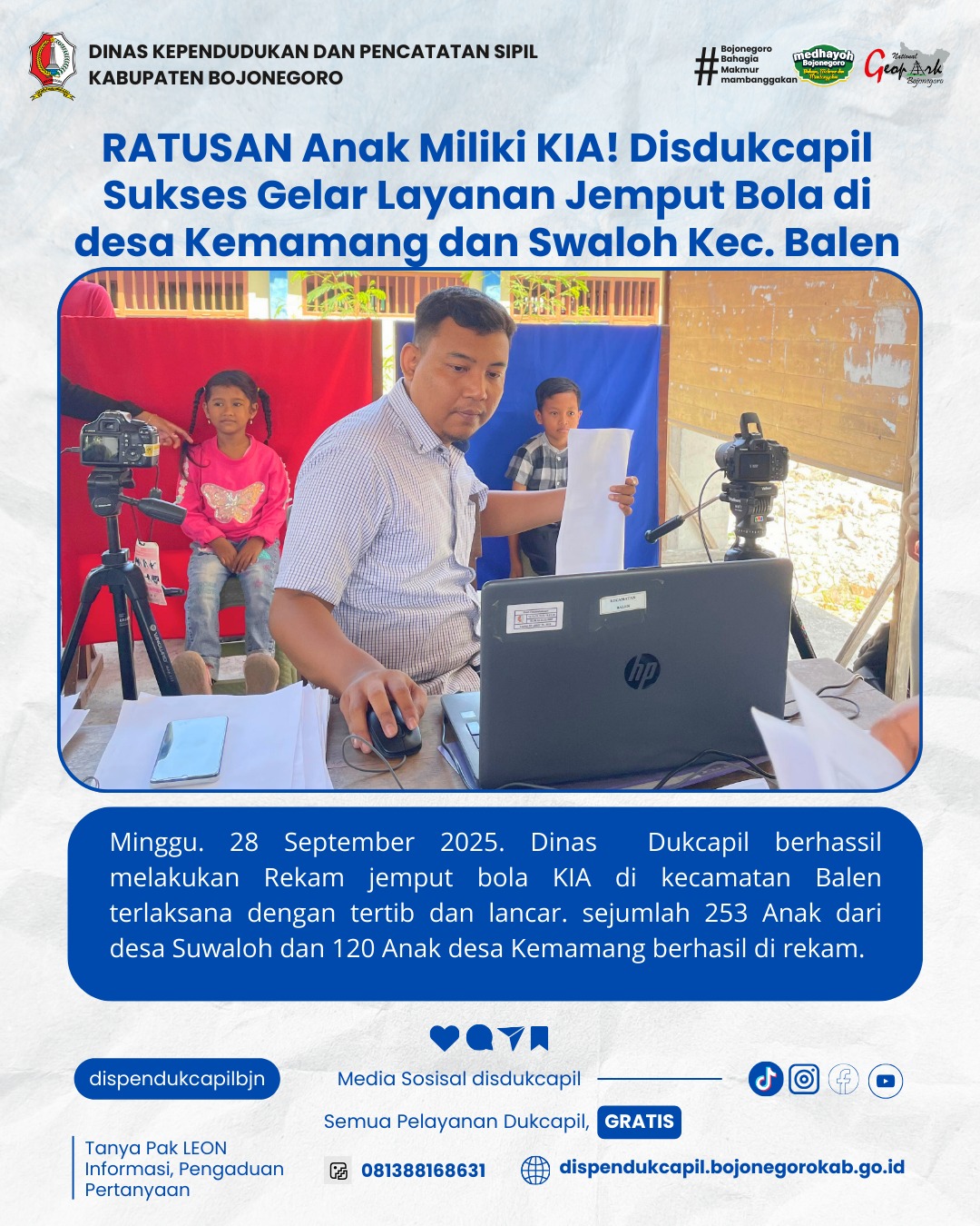 BOJONEGORO, 28/09/2025 – Dinas Kependudukan dan Pencatatan Sipil (Disdukcapil) Kabupaten Bojonegoro kembali mengintensifkan layanan jemput bola, perekaman Kartu Identitas Anak (KIA), sebagai upaya nyata mewujudkan Visi Bojonegoro Bahagia, Makmur, dan Membanggakan.