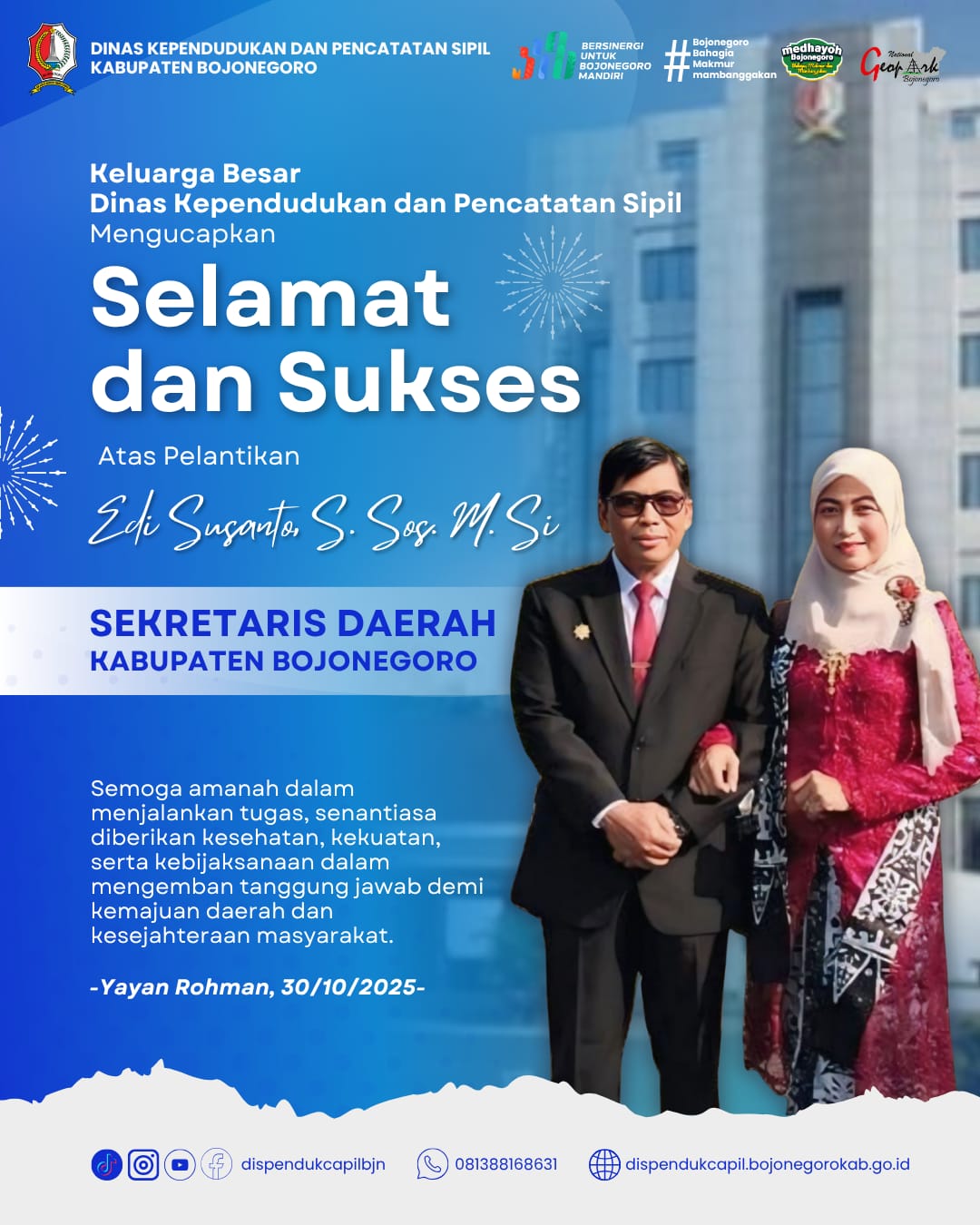 Bojonegoro, 30/10/2025. Keluarga Besar Dinas Kependudukan dan Pencatatan Sipil Kabupaten Bojonegoro mengucapakan SELAMAT DAN SUKSES atas dilaktiknya Bapak Edi Susanto, S. Sos. M. Si sebagai Sekretaris Daerah Kabupaten Bojonegoro.