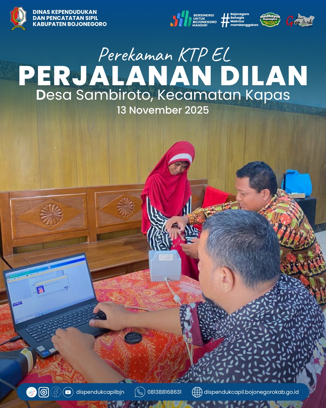 Bojonegoro, 13 November 2025, Pelayanan administrasi kependudukan kembali hadir lebih dekat kepada masyarakat. Pada hari ini, petugas Dinas Kependudukan dan Pencatatan Sipil melaksanakan kegiatan jemput bola perekaman KTP-el bagi penduduk penyandang disabilitas di Desa Sambiroto, Kecamatan Kapas.