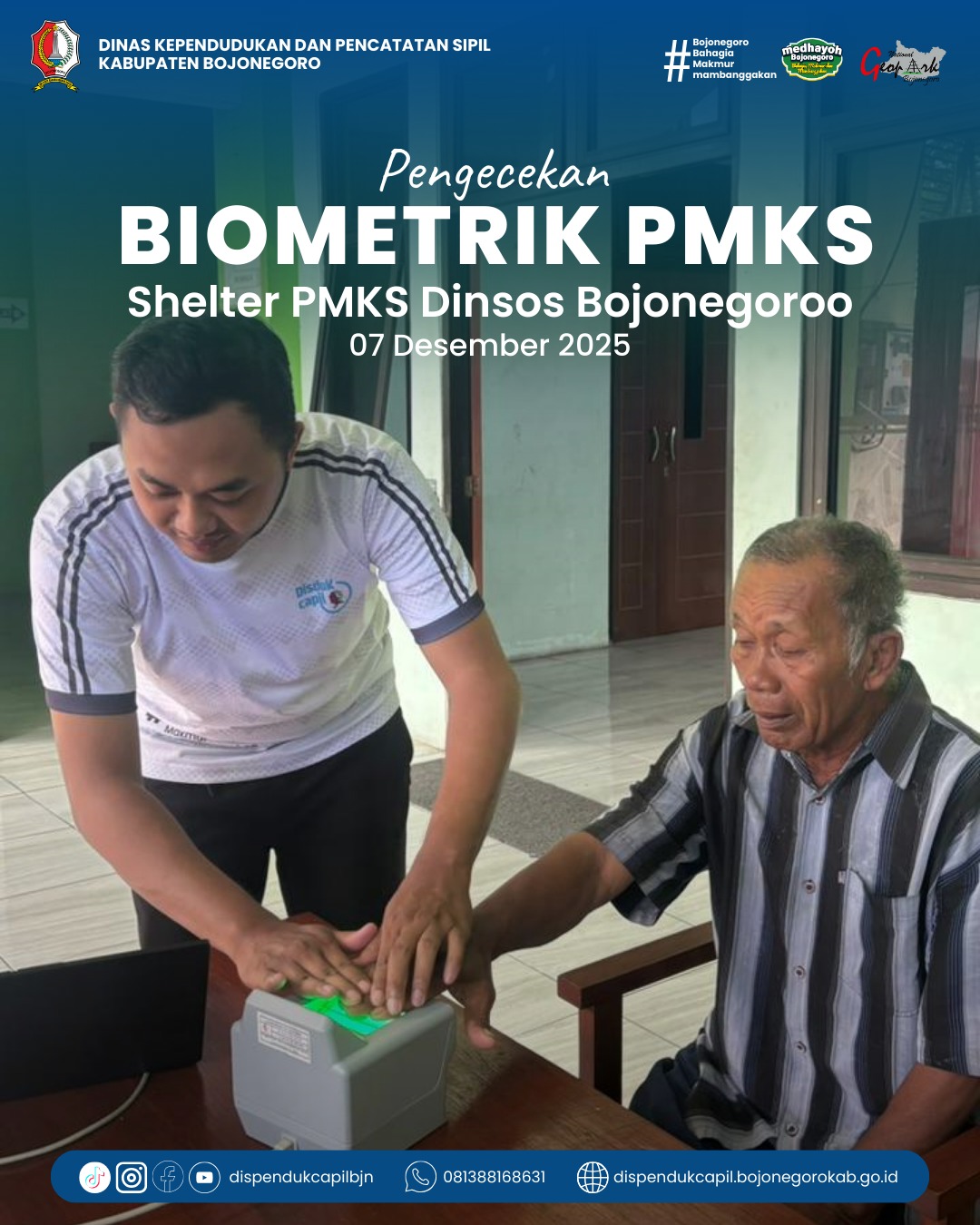 Bojonegoro, 07/12/2025 - Dinas Kependudukan dan Pencatatan Sipil bersama Dinas Sosial melakukan verifikasi biometrik terhadap seorang orang terlantar yang ditampung di Selter PMKS Dinsos. Kegiatan ini dilakukan sebagai langkah penting untuk memastikan identitas yang bersangkutan sebelum proses pemulangan kepada pihak keluarga di daerah domisili.