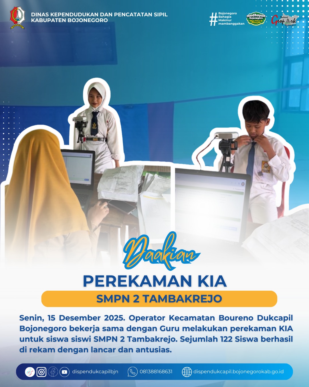 Bojonegoro, 15/12/2025 - Dalam rangka meningkatkan cakupan kepemilikan Kartu Identitas Anak (KIA), Dinas Kependudukan dan Pencatatan Sipil melaksanakan layanan jemput bola perekaman dan penerbitan KIA di SMP Negeri 2 Tambakrejo. Kegiatan ini menyasar peserta didik yang belum memiliki KIA atau perlu pembaruan data kependudukan.