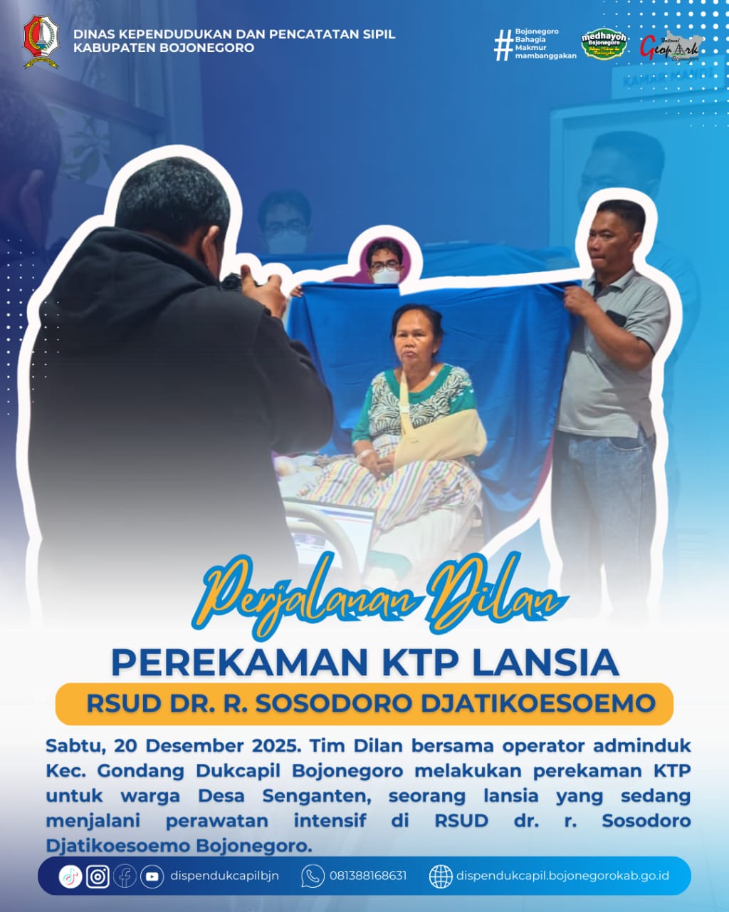 Dinas Kependudukan dan Pencatatan Sipil Bojonegoro melaksanakan layanan jemput bola perekaman KTP-el bagi warga lanjut usia (lansia) asal Desa Senganten, Kecamatan Gondang, yang sedang menjalani perawatan di RSUD Sosodoro Bojonegoro. Layanan ini dilakukan melalui program Perjalanan DILAN sebagai bentuk komitmen pemenuhan hak identitas kependudukan bagi warga yang memiliki keterbatasan kondisi kesehatan.