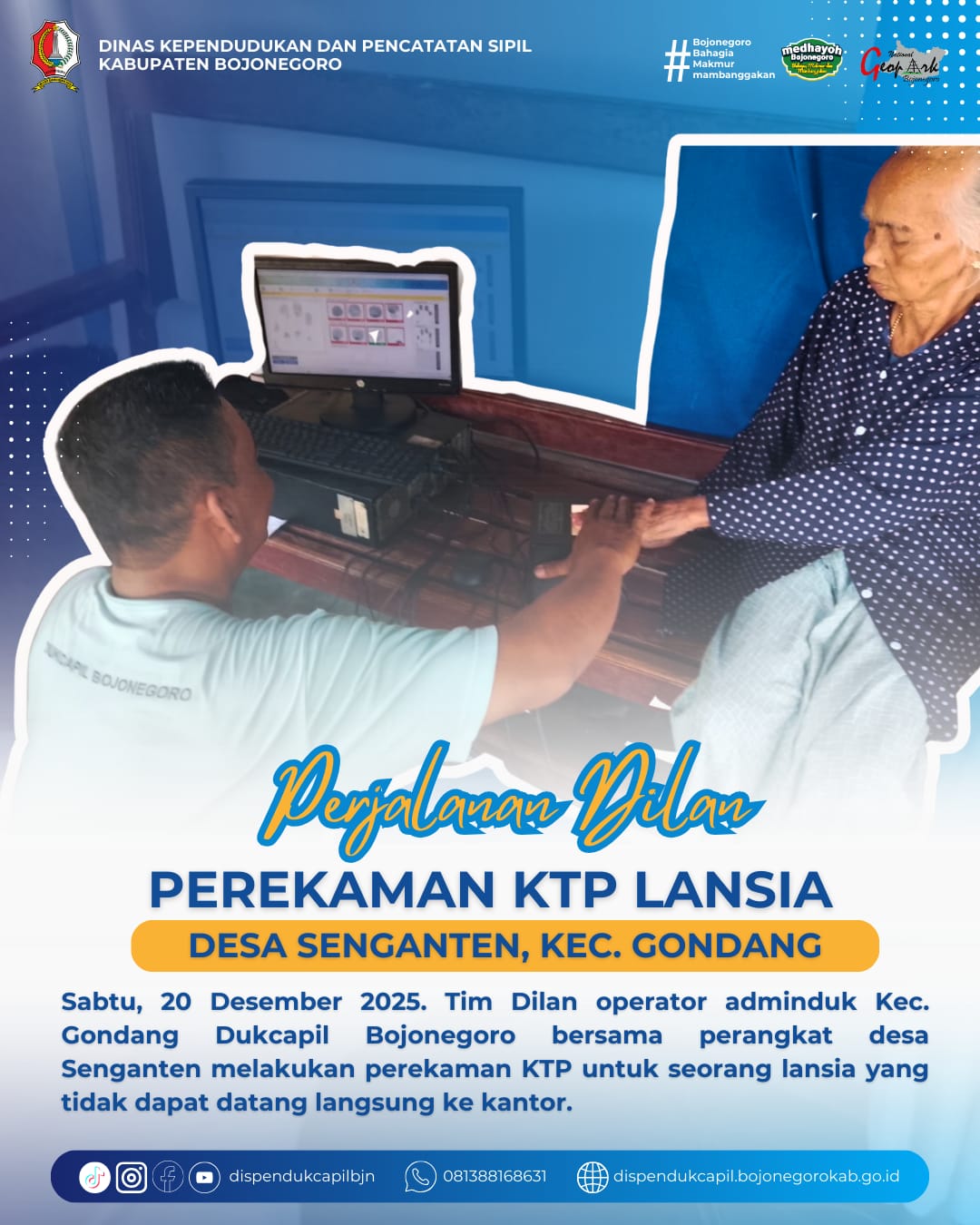 Bojonegoro, 20/12/2025 - Dinas Kependudukan dan Pencatatan Sipil Bojonegoro melaksanakan layanan jemput bola perekaman KTP-el bagi warga lanjut usia (lansia) di Desa Senganten, Kecamatan Gondang, melalui program Perjalanan DILAN. Kegiatan ini bertujuan memastikan pemenuhan hak identitas kependudukan bagi lansia yang memiliki keterbatasan untuk datang langsung ke kantor pelayanan.