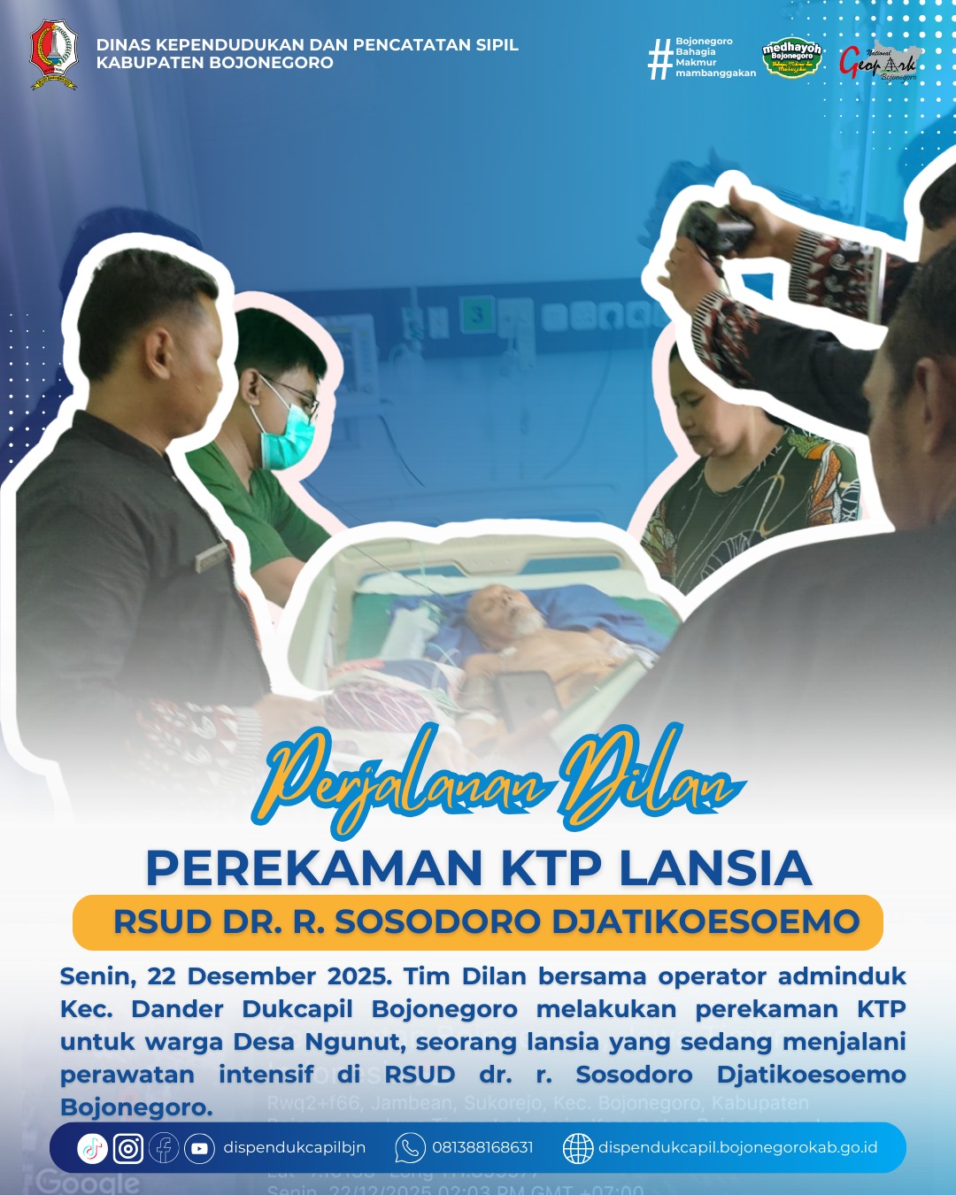 Dinas Kependudukan dan Pencatatan Sipil Bojonegoro melaksanakan layanan jemput bola perekaman KTP-el bagi warga lanjut usia (lansia) asal Desa Ngunut, Kecamatan Dander, yang sedang menjalani perawatan di RSUD Sosodoro Bojonegoro. Layanan ini dilakukan melalui program Perjalanan DILAN sebagai bentuk komitmen pemenuhan hak identitas kependudukan bagi warga yang memiliki keterbatasan kondisi kesehatan.