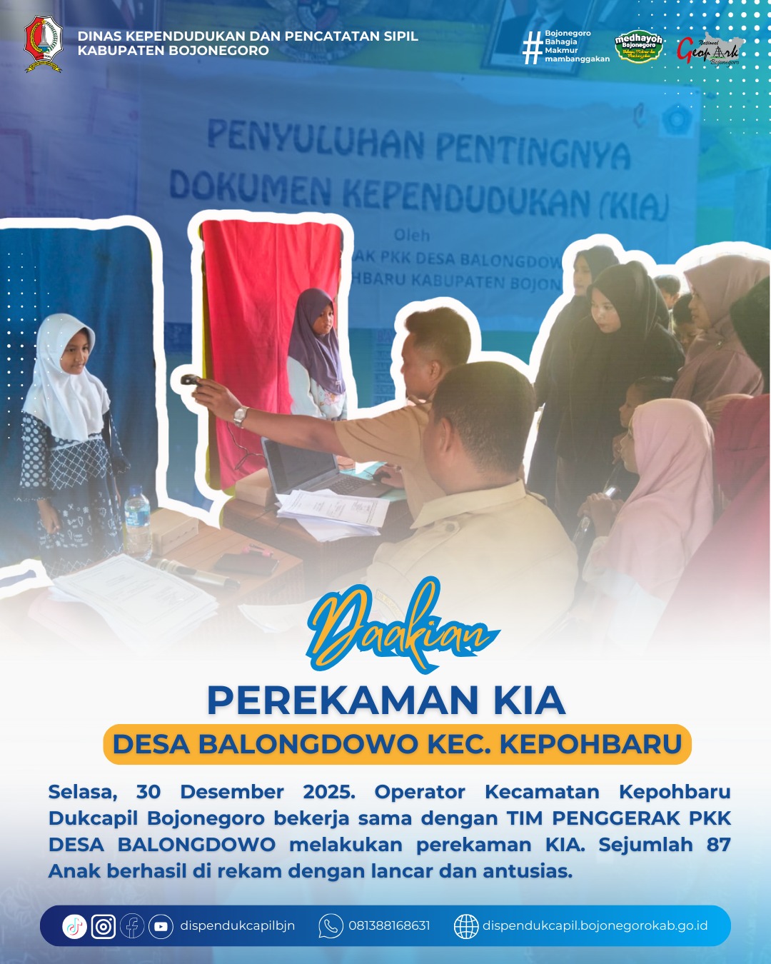 Bojonegoro, 30/12/2026 - Dalam upaya meningkatkan kepemilikan Kartu Identitas Anak (KIA), Tim Penggerak PKK Desa Balongdowo Kecamatan Kepohbaru bekerja sama dengan operator kecamatan kepohbaru melaksanakan kegiatan rekam KIA jemput bola bagi anak-anak di Desa Balongdowo. Kegiatan ini bertujuan untuk mendekatkan layanan administrasi kependudukan kepada masyarakat serta mempermudah orang tua dalam mengurus dokumen identitas anak. sejumlah 87 anak berhasil direkam dengan tertib dan antusias.