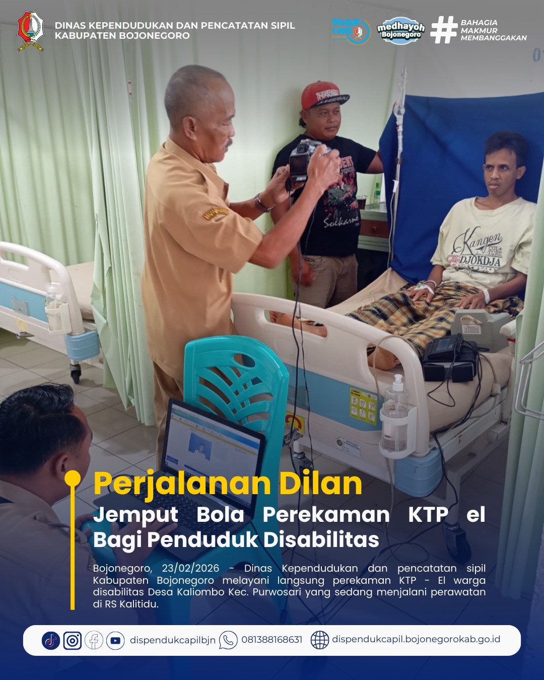 Bojonegoro, 26/02/2026 -Dalam rangka memastikan pemenuhan hak administrasi kependudukan bagi kelompok rentan, Dinas Kependudukan dan Pencatatan Sipil (Dukcapil) Kabupaten Bojonegoro melaksanakan kegiatan perekaman KTP-el bagi penyandang disabilitas bertempat di Rumah Sakit Kalitidu.