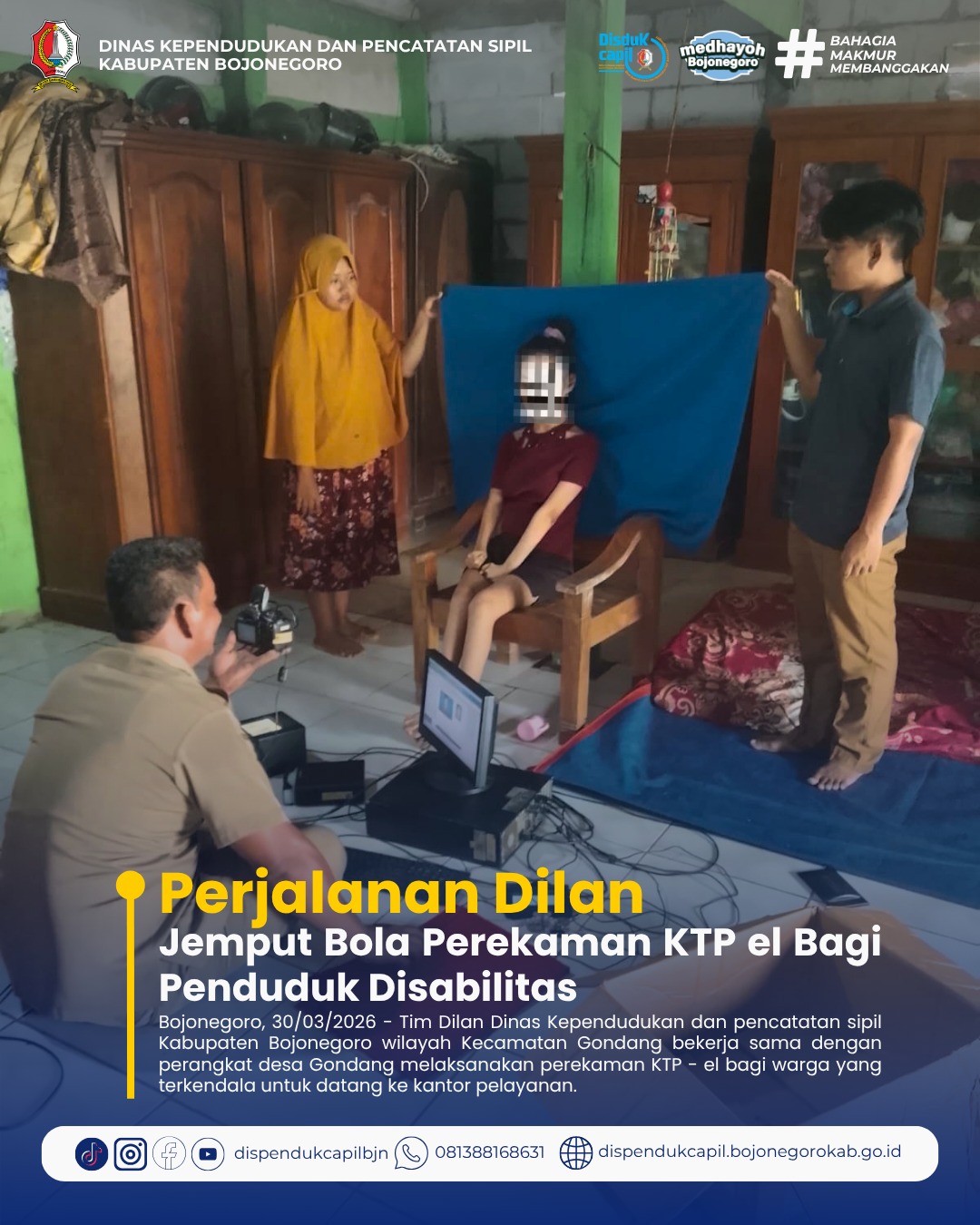 Bojonegoro, 30/03/2026 - Tim Dilan wilayah Gondang bersama perangkat Desa Gondang melaksanakan kegiatan jemput bola pelayanan perekaman KTP elektronik (KTP-el) bagi warga penyandang disabilitas. Kegiatan ini merupakan bentuk komitmen pemerintah dalam memberikan pelayanan administrasi kependudukan yang inklusif dan menjangkau seluruh lapisan masyarakat.