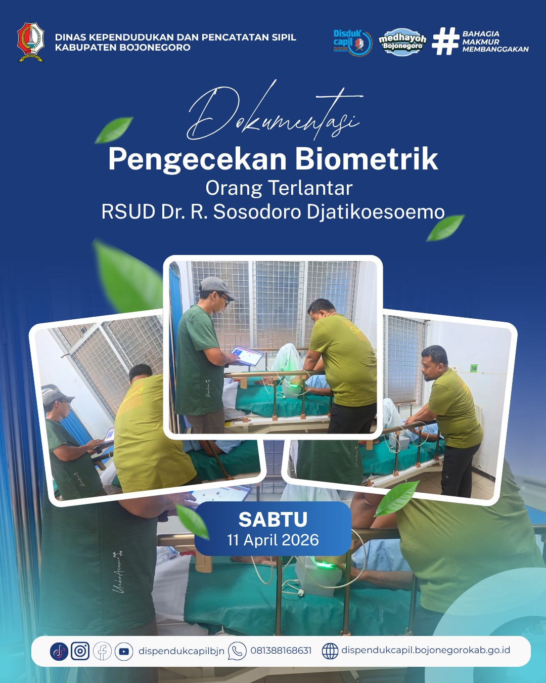 Bojonegoro - Komitmen pelayanan tanpa batas ditunjukkan oleh Dinas Kependudukan dan Pencatatan Sipil (Disdukcapil) Kabupaten Bojonegoro dengan tetap melaksanakan kegiatan pengecekan biometrik bagi orang terlantar di RSUD Dr. R. Sosodoro Djatikoesoemo, meskipun bertepatan dengan hari libur, Sabtu (11/4/2026).