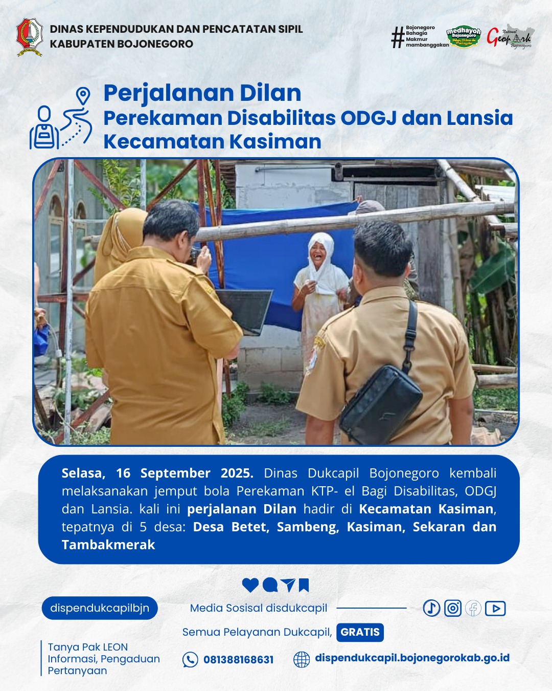 Selasa, 09 September 2025 - Dinas Kependudukan dan Pencatatan Sipil Kabupaten Bojonegoro kembali melaksanakan inovasi pelayanan DILAN (Pelayanan Disabilitas, ODGJ dan Lansia)...