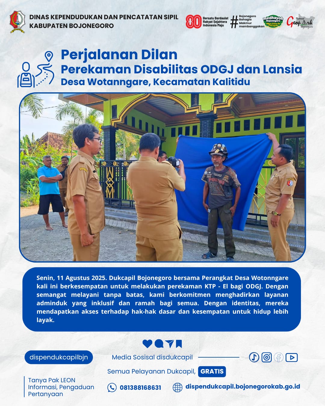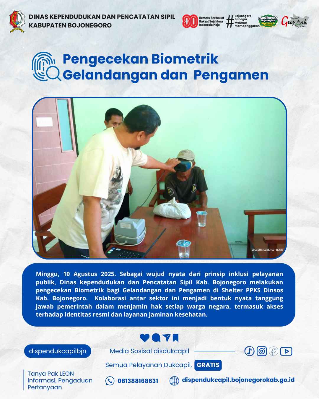 Bojonegoro, 10 Agustus 2025 – Dinas Kependudukan dan Pencatatan Sipil (Disdukcapil) Kabupaten Bojonegoro melakukan kegiatan pengecekan biometrik bagi gelandangan dan pengamen di...