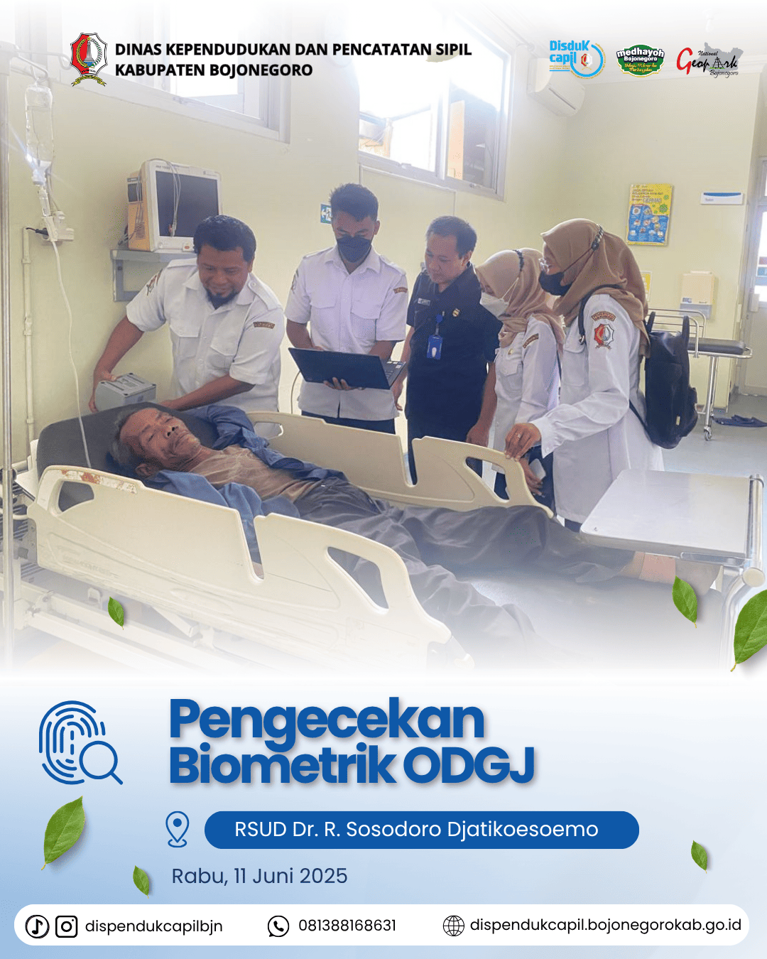 Rabu (11/06/2025), Dinas Kependudukan dan Pencatatan Sipil Kabupaten Bojonegoro telah melakukan Pengecekan Biometrik Orang Dalam Gangguan Jiwa (ODGJ) di RSUD DR. R....