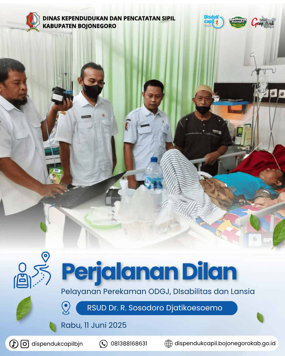Kamis, (12/06/2025), Dinas Kependudukan dan Pencatatan Sipil Kabupaten Bojonegoro melakukan Perjalanan Dilan (Pelayanan Perekaman Disabilitas, ODGJ, Disabilitas dan Lansia) di RSUD DR. R....
